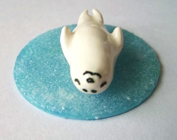 半磁器土で焼いた真っ白なアザラシのコドモと、ディスプレイ用に作ったプラバン製の丸い氷をセットで作りました。