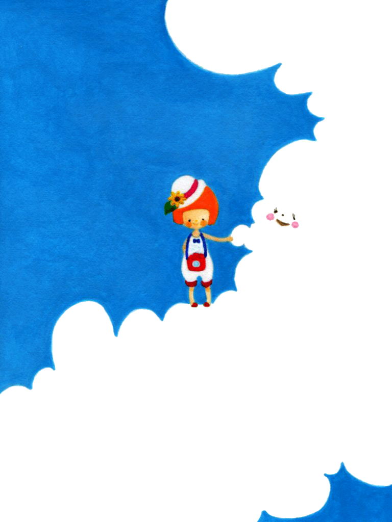 ある夏のこと。外で遊んで走っているうちに・・・気がつくと雲の上にいた。青い空に囲まれていた。それから、雲と友だちになれたよ。・・・という妄想から描きました♪