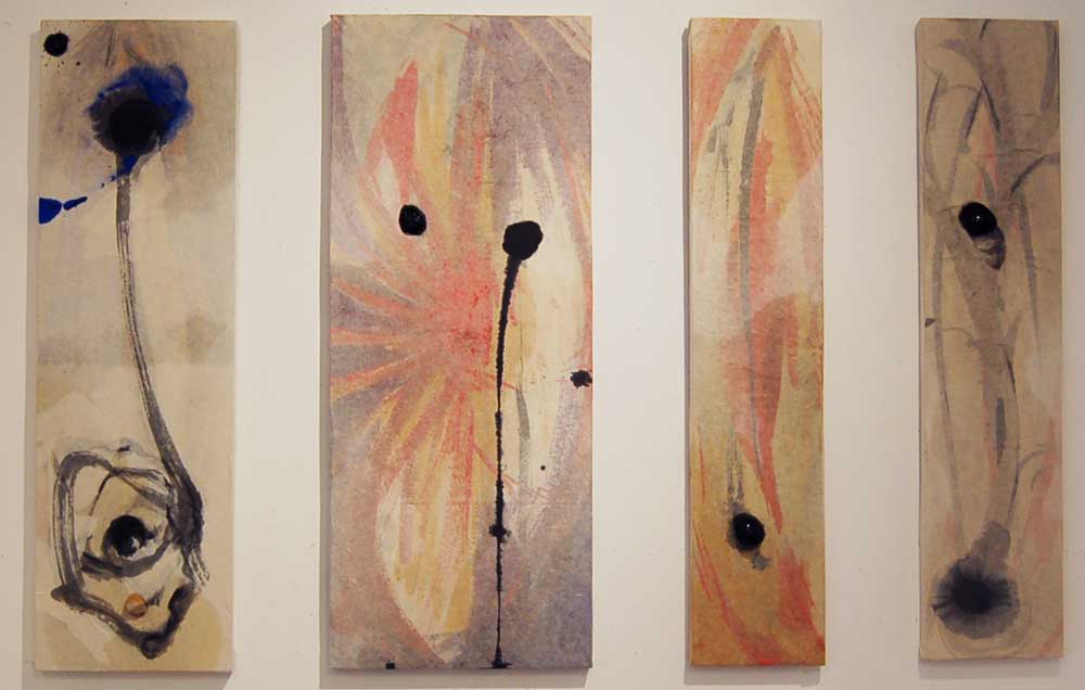 日本古来の素材である手漉き和紙、墨、膠、顔料に回帰し、何層も和紙を重ね視えることと視えないこと、表層と内部といった構成の中、原風景である自分にとっての現象を、唐突に現れて消えていくある現象を、その素材の中に落とし込めることができたら、と考えています。