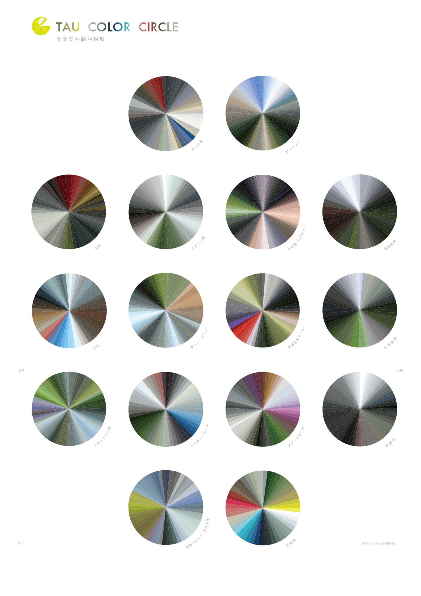 多摩美のキャンパス内に隠れている色を視覚化したインフォグラフィックスです。各棟から周囲5mの範囲を写真撮影し、それをPhotoshopでモザイク加工し、更に円グラフに1つ1つ置き換え、作成して並べました。
