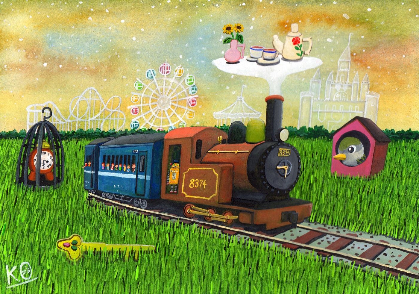 ふと、西武の山口線で昔走っていたような所謂「お伽列車」的な世界を描きたいなー、などと思って描いたもの。背後の遊園地は「幻」っぽさ/「おぼろげな記憶」のような感じを出したくて(観覧車以外は)全部白一色で描いております。