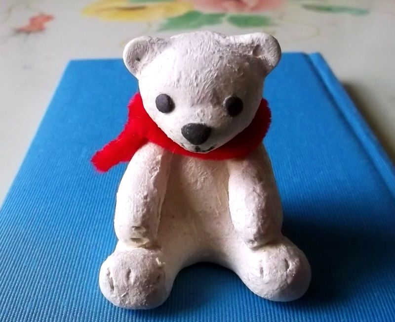 白い土で焼いた、テディ・シロクマです。赤いモールのマフラーが暖かそう。