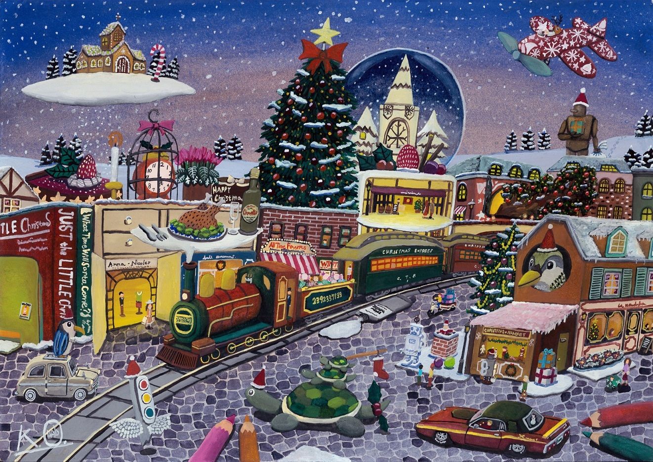 今年のクリスマスイラスト。A3(297×420)のイラストボードに水彩絵の具で描いたもの。