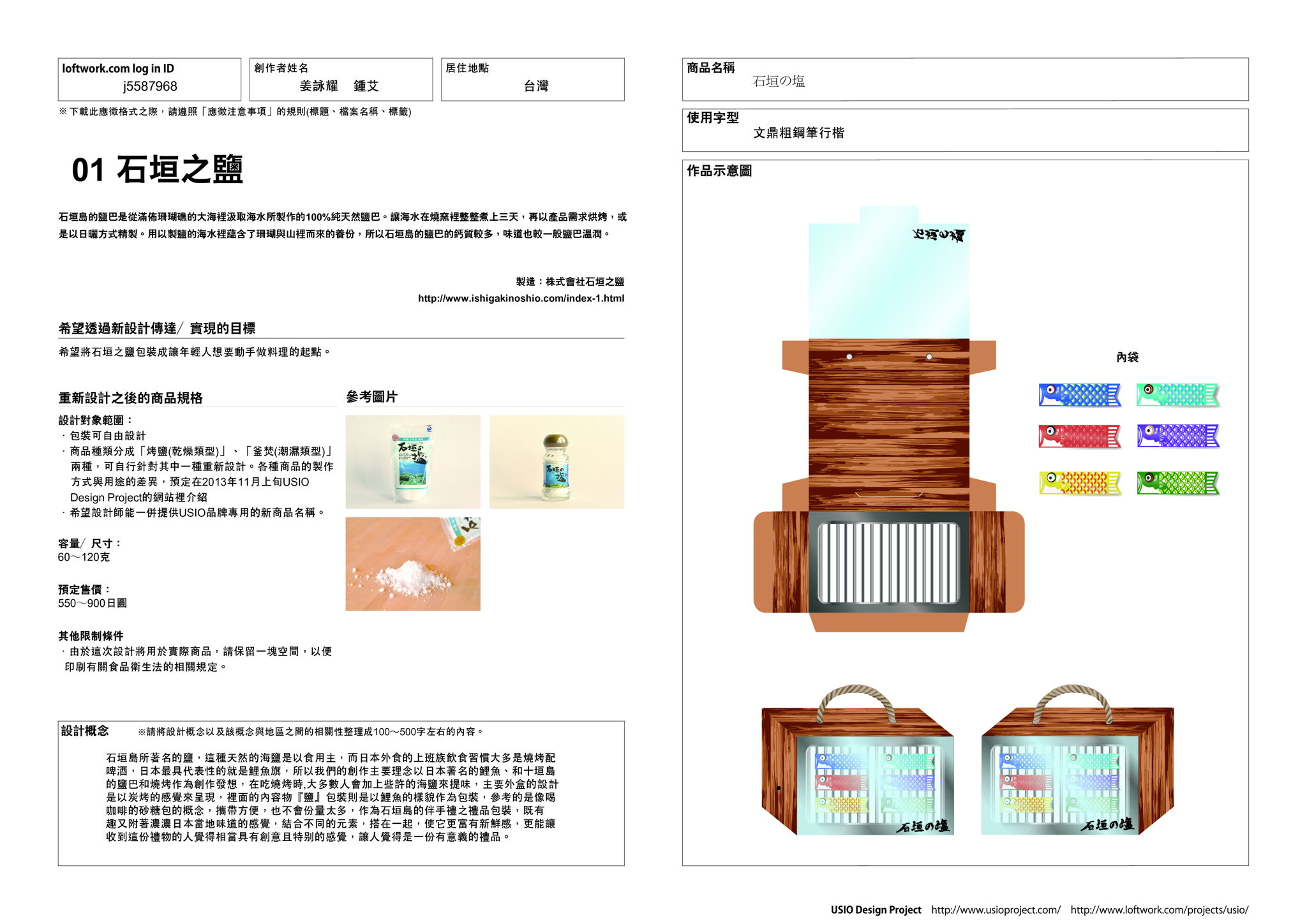 石垣島所著名的鹽,這種天然的海鹽是以食用主,而日本外食的上班族飲食習慣大多是燒烤配啤酒,日本最具代表性的就是鯉魚旗,所以我們的創作主要理念以日本著名的鯉魚、和十垣島的鹽巴和燒烤作為創作發想,在吃燒烤時,大多數人會加上些許的海鹽來提味,主要外盒的設計是以炭烤的感覺來呈現,裡面的內容物『鹽』包裝則是以鯉魚的樣貌作為包裝,參考的是像喝咖啡的砂糖包的概念,攜帶方便,也不會份量太多,作為石垣島的伴手禮之禮品包裝,既有趣又附著濃濃日本當地味道的感覺,結合不同的元素,搭在一起,使它更富有新鮮感,更能讓收到這份禮物的人覺得相當具有創意且特別的感覺,讓人覺得是一份有意義的禮品。