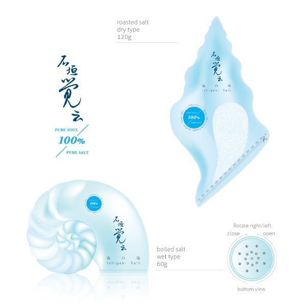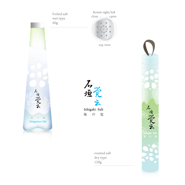 石垣海塩是來自大海的禮物,島民用辛勤與智慧,從大海中淬煉精華,注入南島的熱情活力,烘培出舌尖甜潤口感的記憶氣味。包裝概念取自於天然的貝殼造型,有種渾然天成的純淨之美,裡頭收藏著海洋風味,予人珍貴、精緻、細心呵護的感受。透明閃耀著水藍色貝殼光澤的瓶身,與海鹽顆粒相互輝映,讓人回憶起石垣島於茂登岳、名藏灣山海、陽光、沙灘律動的迷人景緻及樂天爽朗的島民。