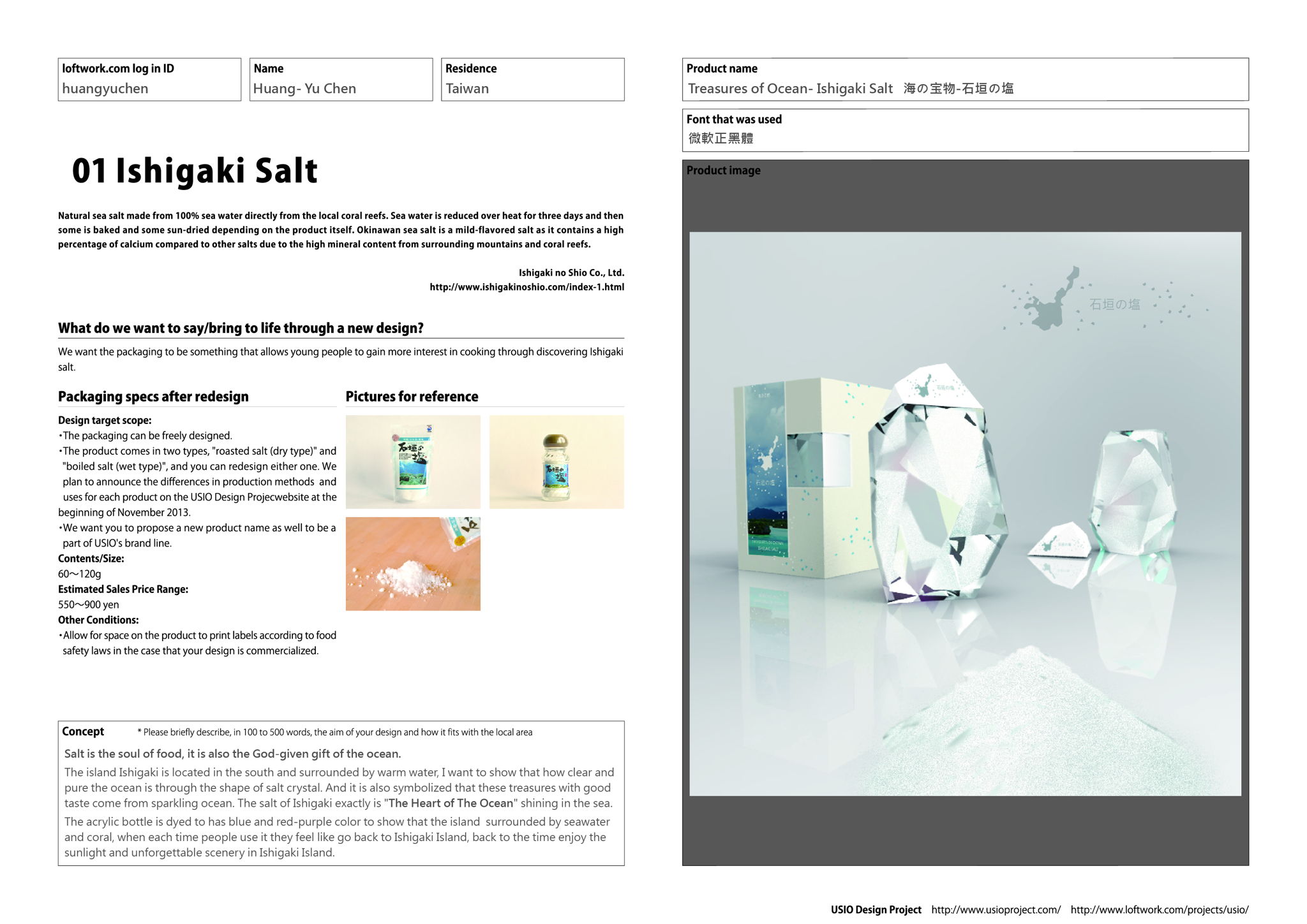 The island Ishigaki is located in the south and surrounded by warm water, I want to show that how clear and pure the ocean is through the shape of salt crystal. And it is also symbolized that these treasures with good taste come from sparkling ocean. The salt of Ishigaki exactly is "The Heart of The Ocean" shining in the sea.