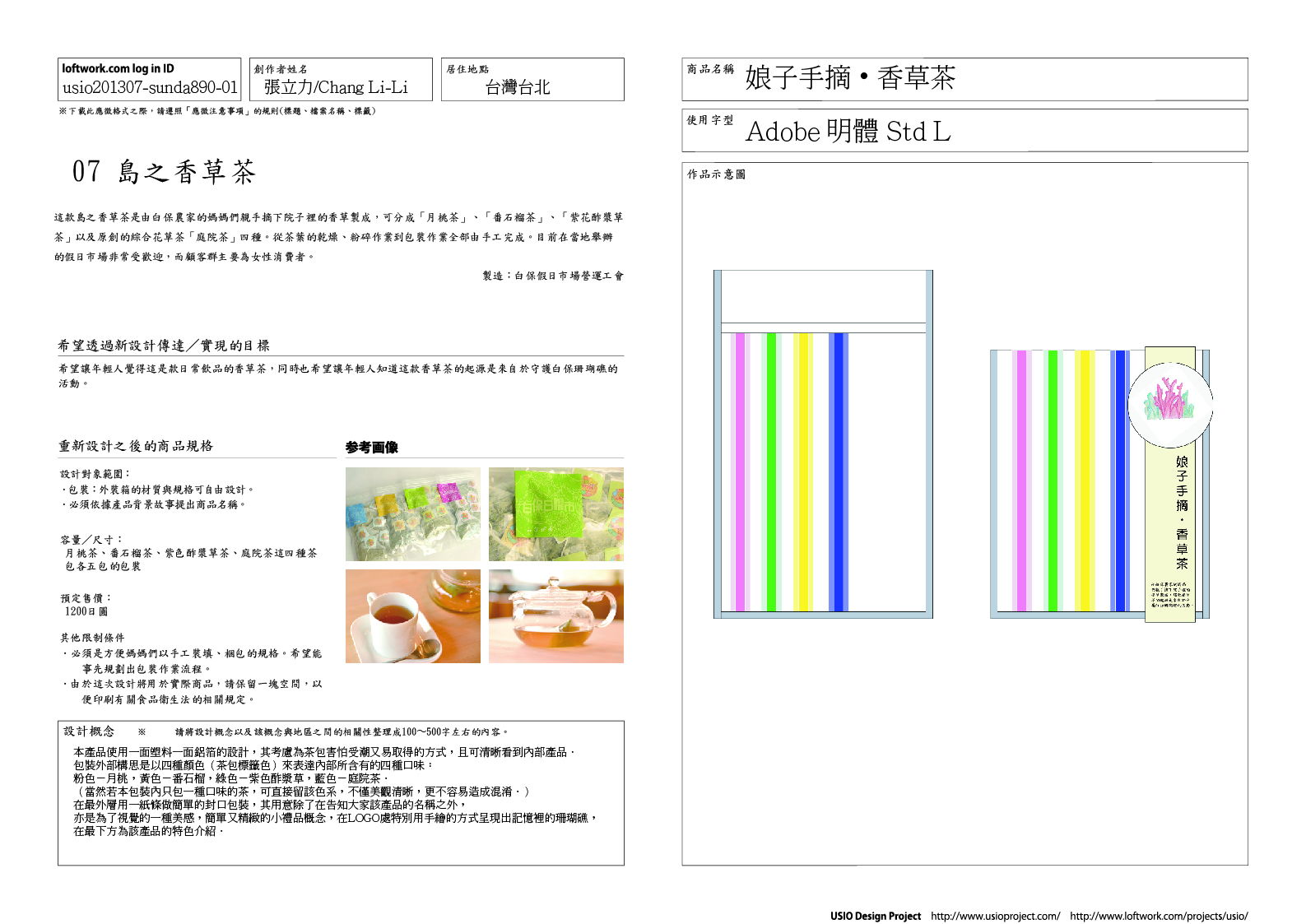 包裝外部構思是以四種顏色(茶包標籤色)來表達內部所含有的四種口味:粉色-月桃,黃色-番石榴,綠色-紫色酢漿草,藍色-庭院茶.