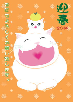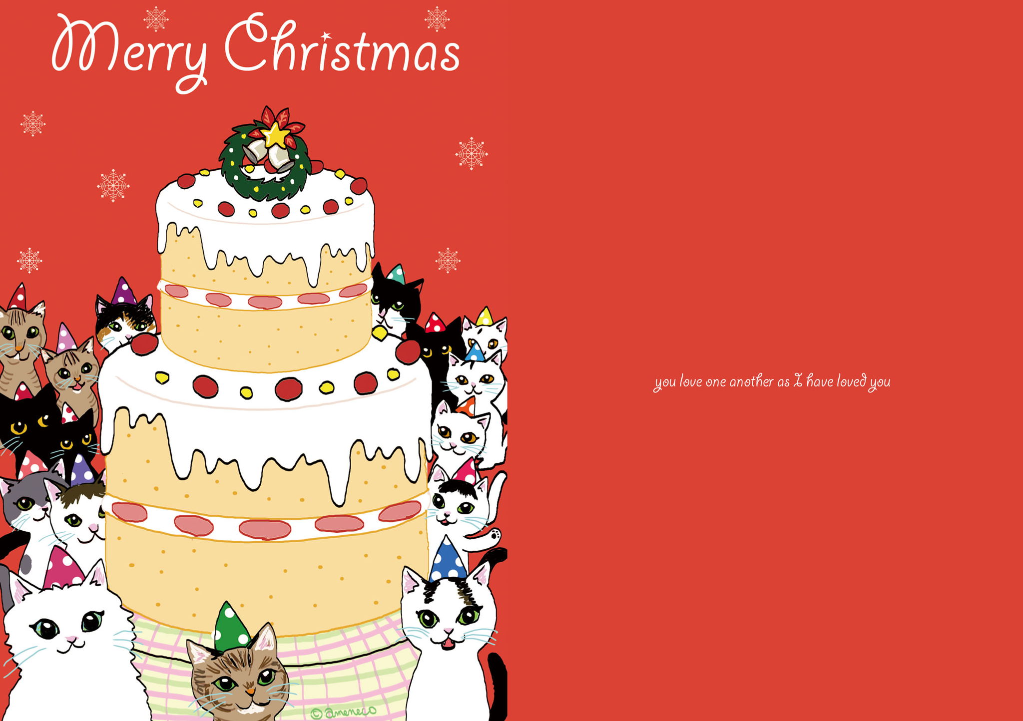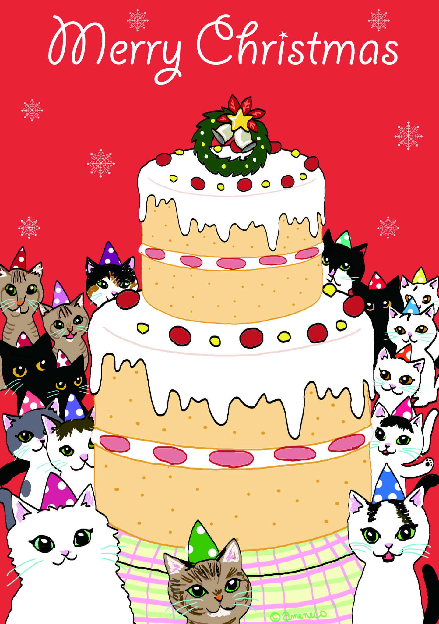 猫たちのクリスマスパーティーです。はがきサイズと二つ折りにしてカードの表紙(裏表紙に使えるものを作成しました。