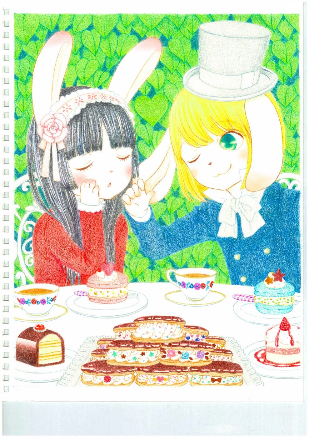 色鉛筆で描いた後、PCにて色の調整をしました。