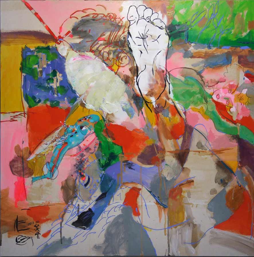 この絵はパネルに張りつけてある紙をはがしている最中に、はがせている部分と地のパネルまで傷つけてしまったのとが混然とそていて、そのパネルのディテールが面白くて、なんのキッチリとした構想も無く考えつくままにダーマトグラフ(エンピツの一種)で描き、そのまま色を重ねていった。