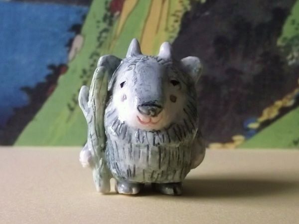 仙人のような穏やかな顔をして、木の杖を持ったシシ神様。