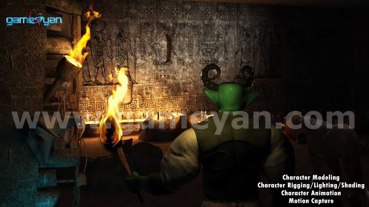 This poster is about Character Modeling for Games of Movies with fire and with black jaguar and green character of ancient style with good HD Animation by game development outsourcing.