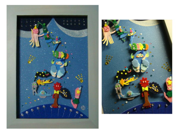 エイリアンがパーティを楽しんでいます。実は「ALIEN」の文字になっております。透明水彩とフェルトとビーズ類で制作。半立体の作品です。