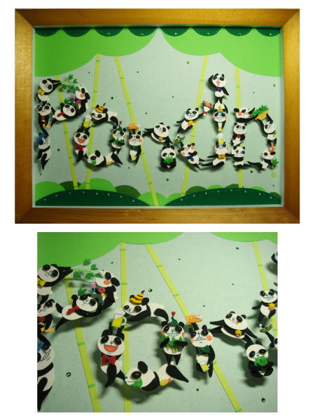 パンダがパーティを楽しんでいます。実は「Panda」の文字になっております。透明水彩とフェルトとビーズ類で制作。半立体の作品です。