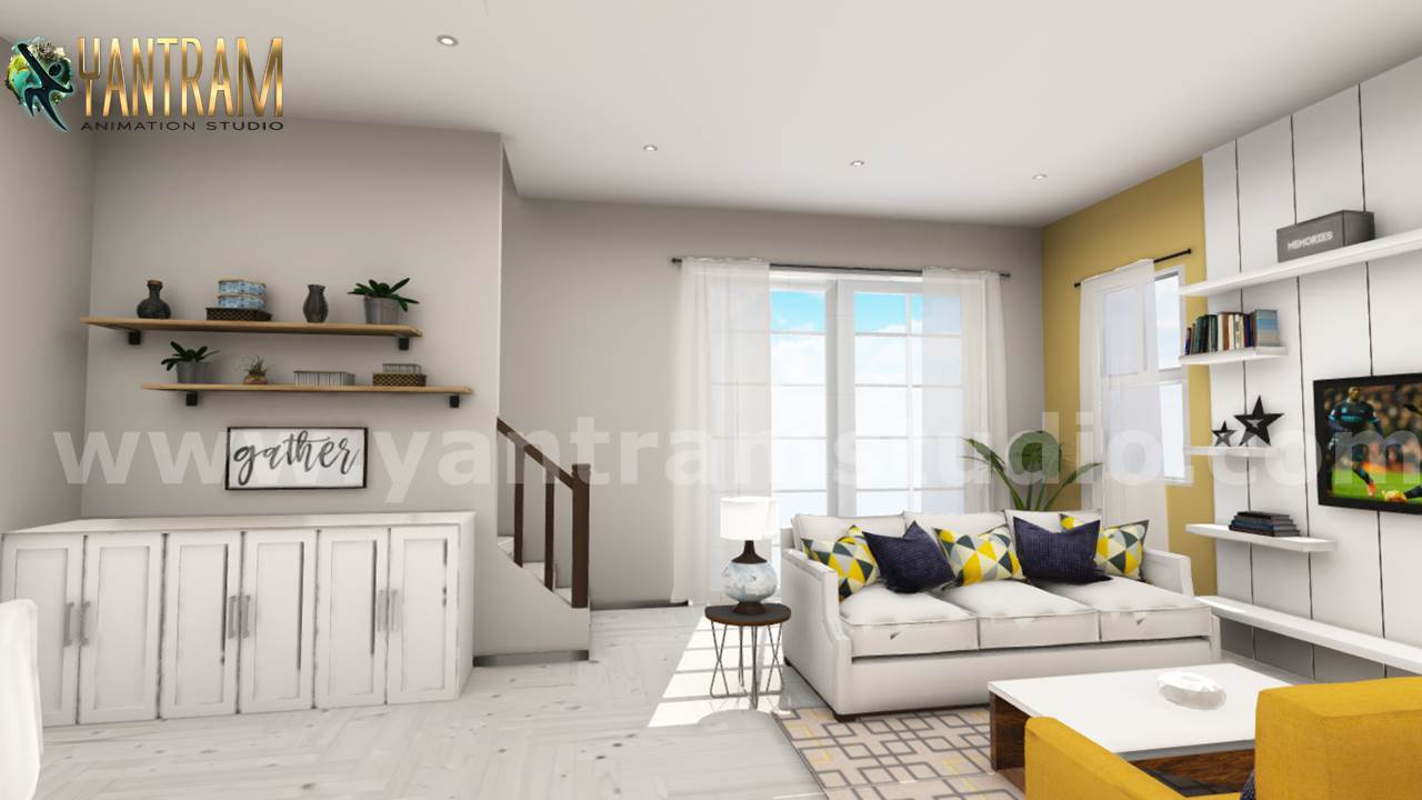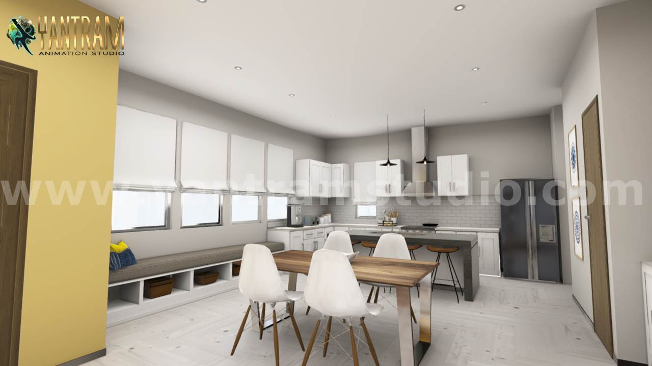 不動産3D建築インテリアCGIモデリングキッチンとリビングルームのリビングルームのデザインのリビングルームのデザイン、ダイニングエリア&朝食テーブル付きキッチンバーチャルツアー、ペンダント、建築レンダリング会社によるリビングインテリアデザイン 、マルタ - ヨーロッパ