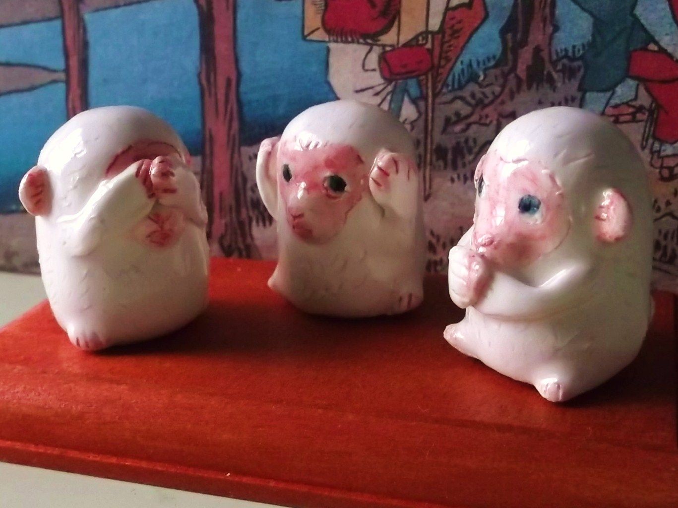 悪いものを見てはいけない、悪い話を聞いてはいけない、 悪い言葉を口にしてはいけない、という戒めをサルの形で現した陶人形です。