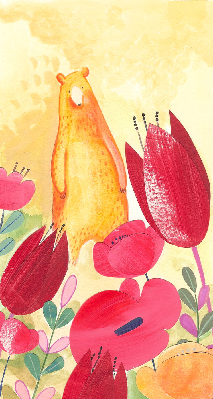 The bear has woken up from hibernation to see the flowers blossomed. Also available for download for iPhone wallpaper.
