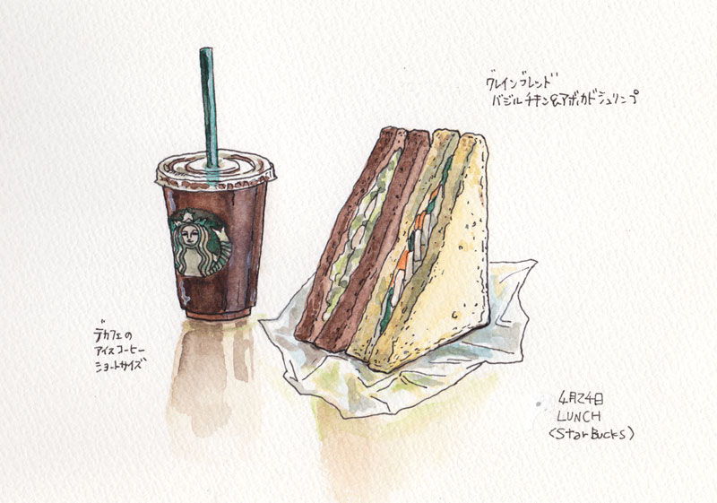 デカフェのアイスコーヒー、サンドイッチ(バジルチキン、アボカドシュリンプ)