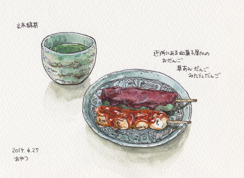 お茶と近所の和菓子屋さんの草あんだんご、みたらしだんご