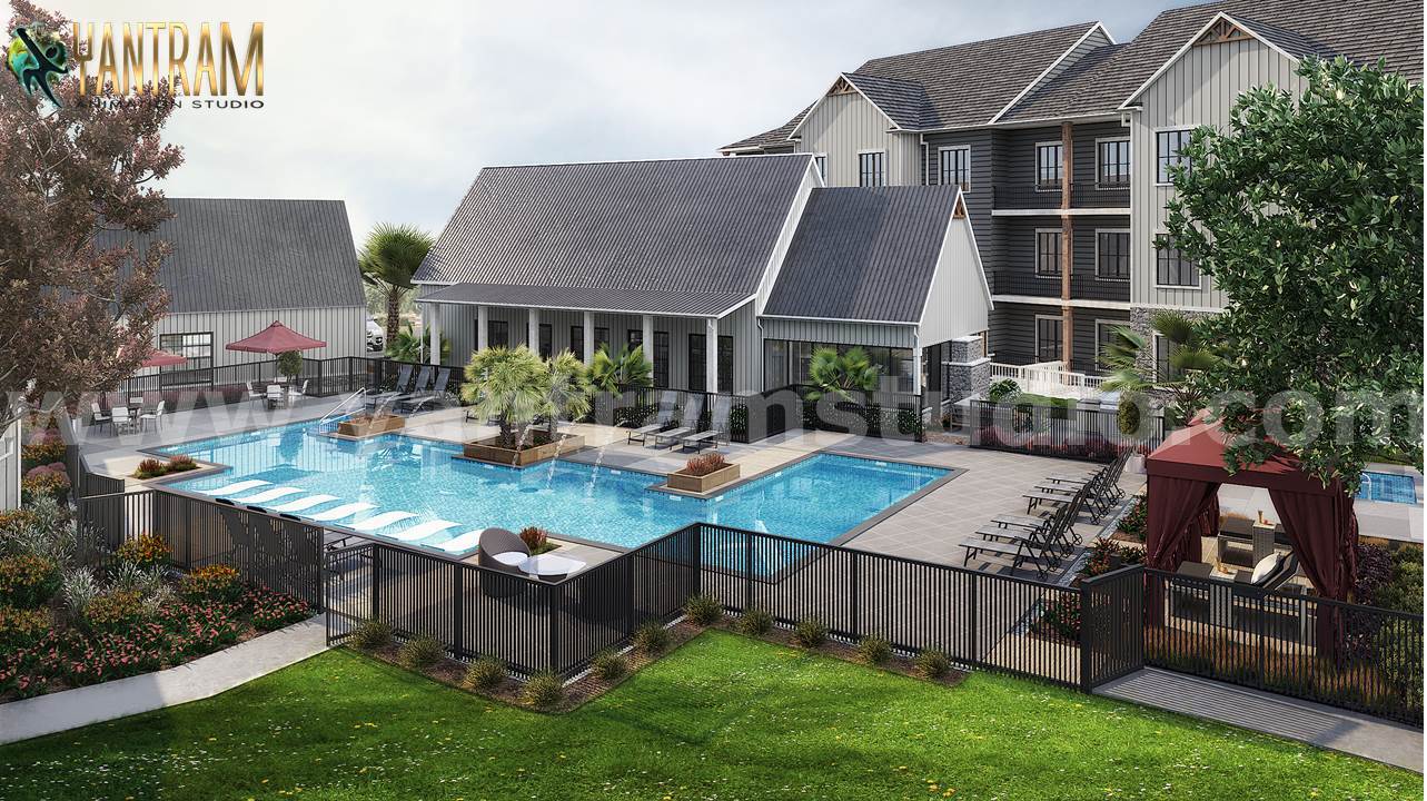 イーストウォークウェイからのプールビューからの3Dアニメーションアニメーション、芝生フィールド、3Dレンダリングを備えた、豪華なクラブハウスのデザイン、屋根、デザインに基づく3Dの外観と風景。 ウォーターフロントのクラブハウスで