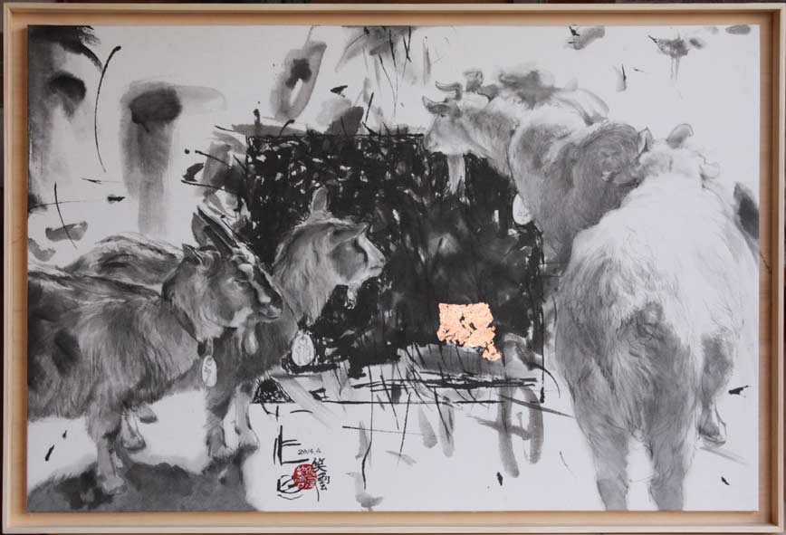 前述のような、これはこうだと言う基礎があらゆる事でゆがめられて行く現象を思いながら、羊と山羊でこうした事ごとを絵の中に茫洋とした考えを混ぜ込んで行った。