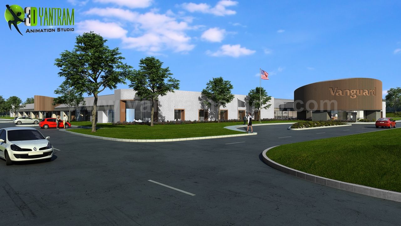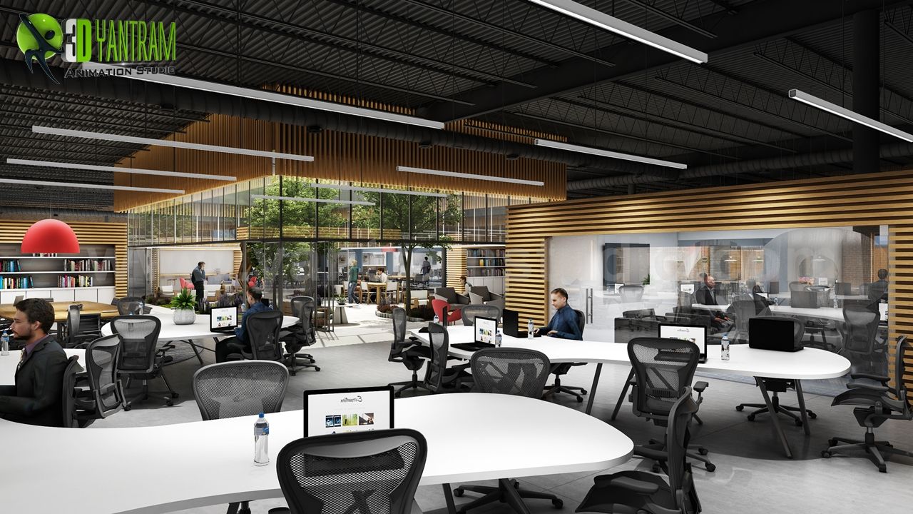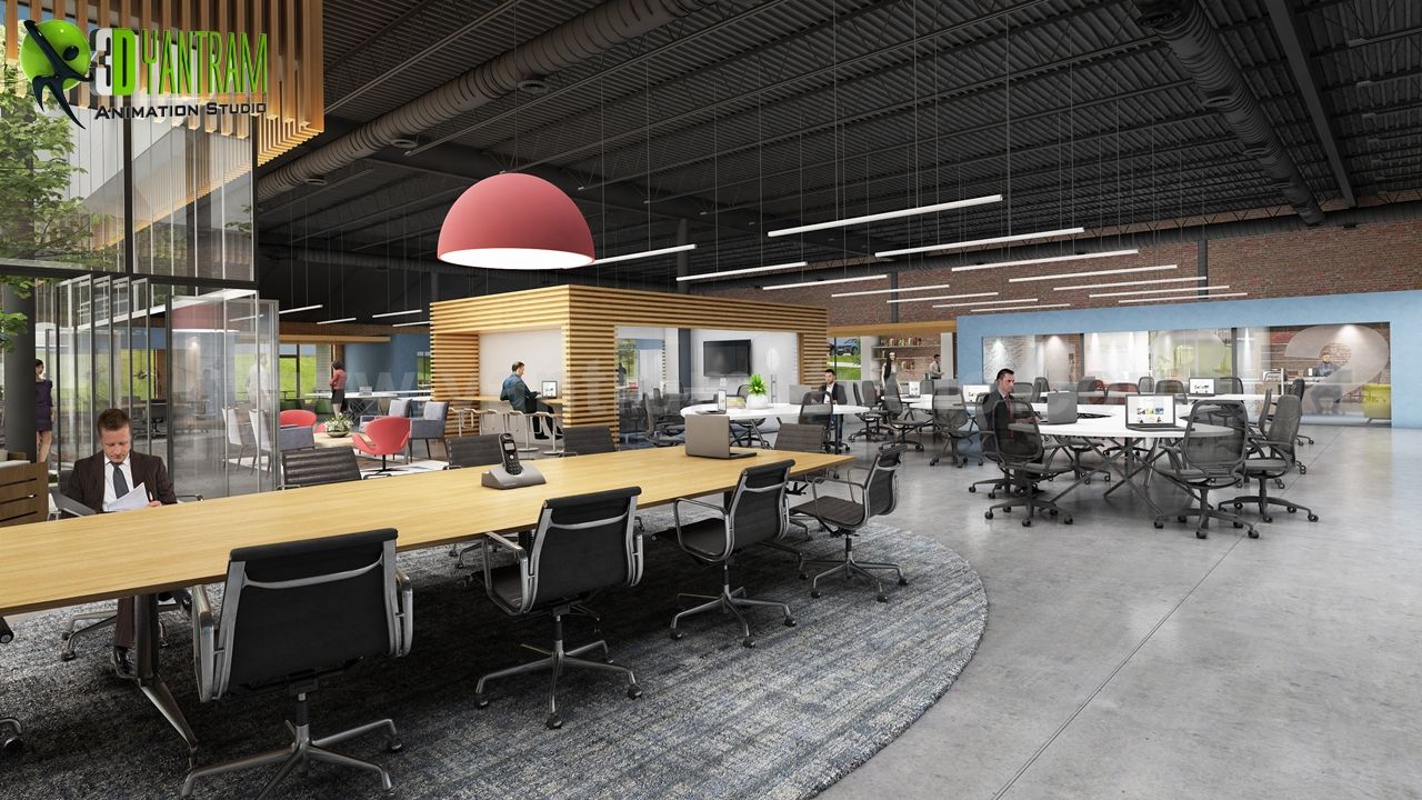 現代的な完璧なオフィスのすべての機能を含む大規模オフィスエリアをデザインし、バーチャルツアーの形で視覚化するというアイデア。 Architectural 3D Walkthroughには、自然の景観と照明、ロビーエリア、レセプションエリア、会議室、パントリーエリア、リフレッシュメントエリア、ワークステーション、ガーデンエリア、Architectural Modeling Firmによるパーソナルオフィスエリアのある外部建物が含まれています。