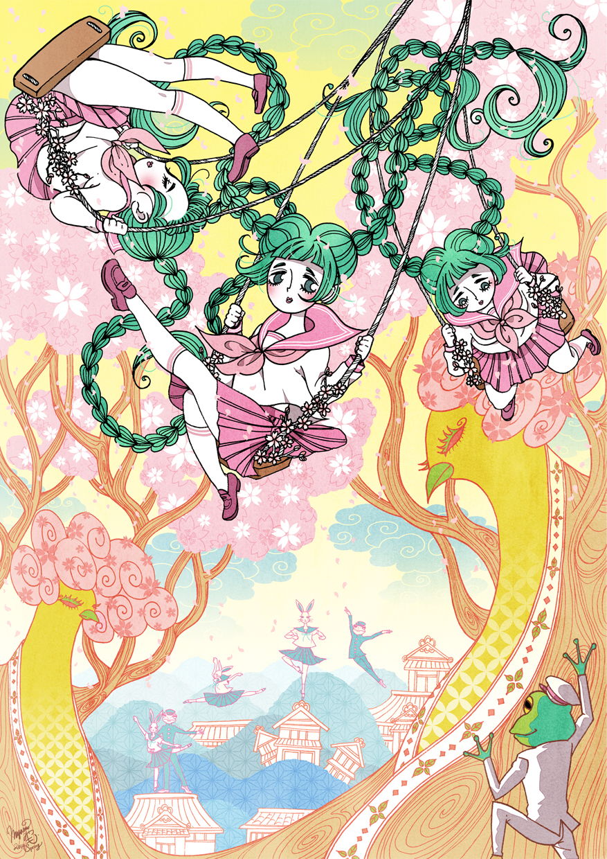 春風を運ぶ緑の髪の春風ちゃん。そして芽吹く桜鳥。ウサギとカエルが春の訪れを喜び、バレエを踊っています。