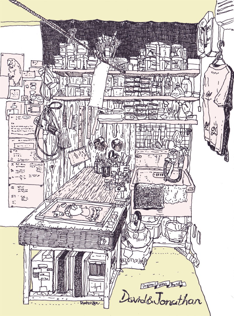 お店に何度か遊びに行った際、オット氏と遠間さんが話し込んでいるその脇で(その隙に)スケッチしました。
