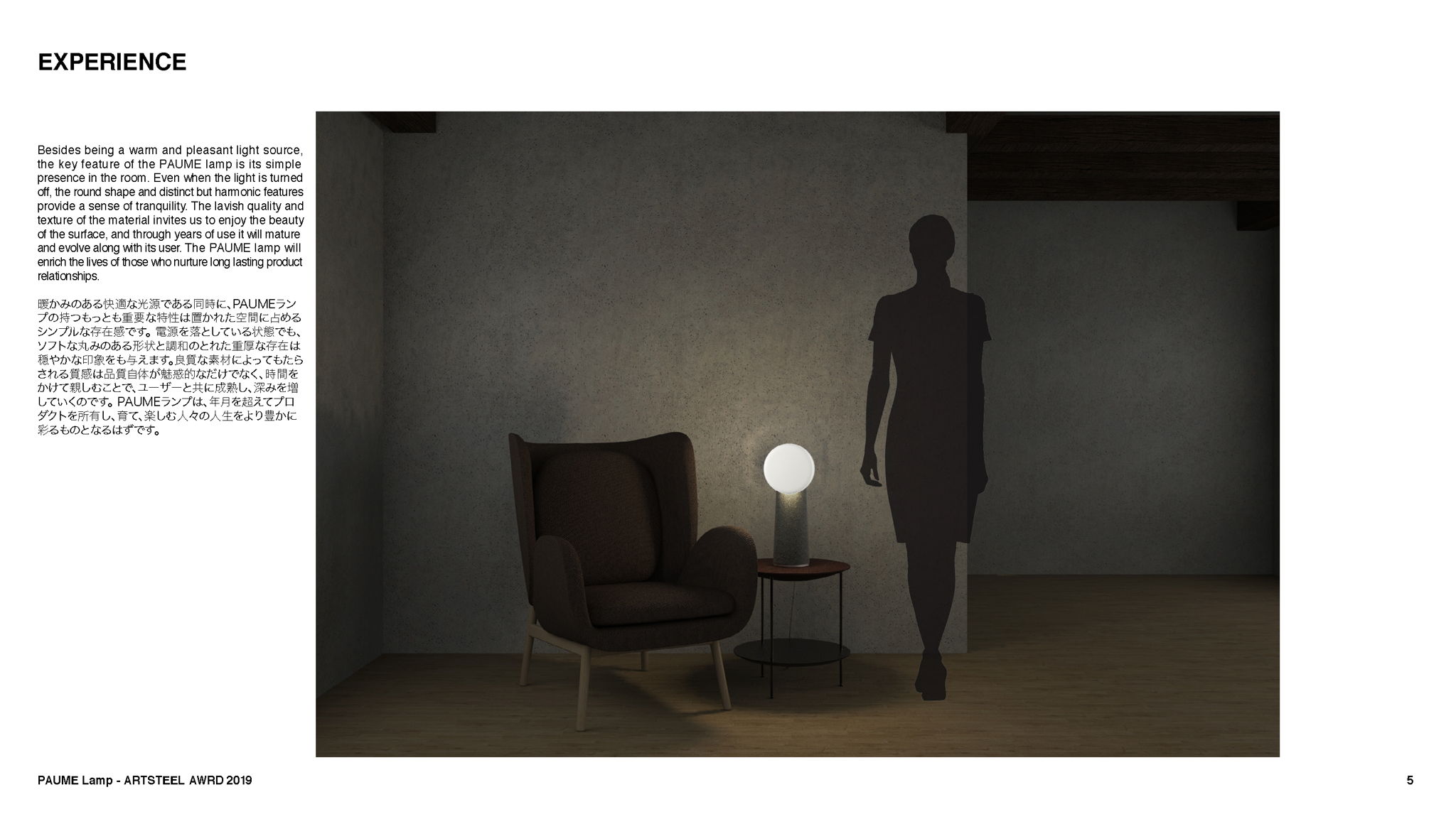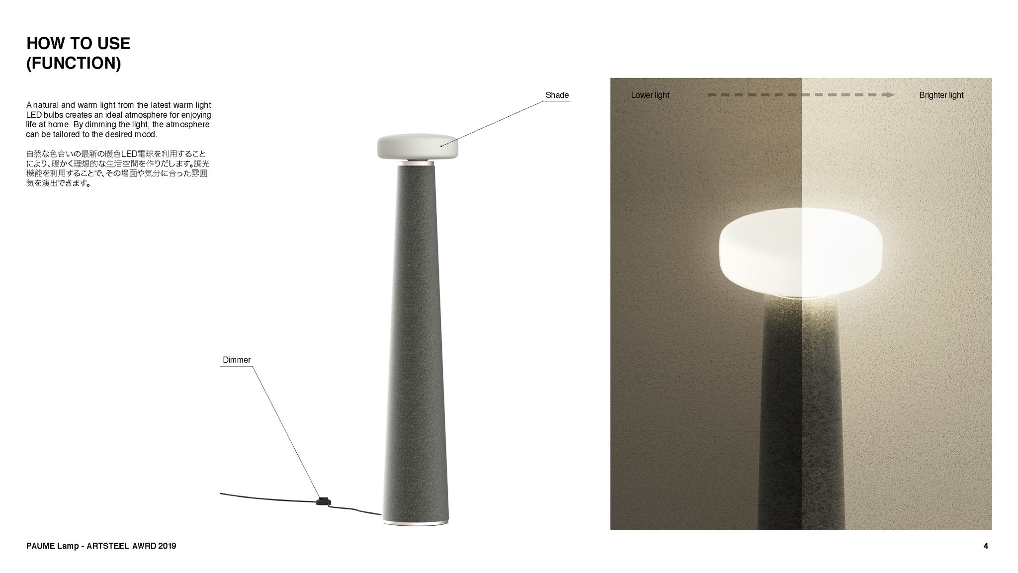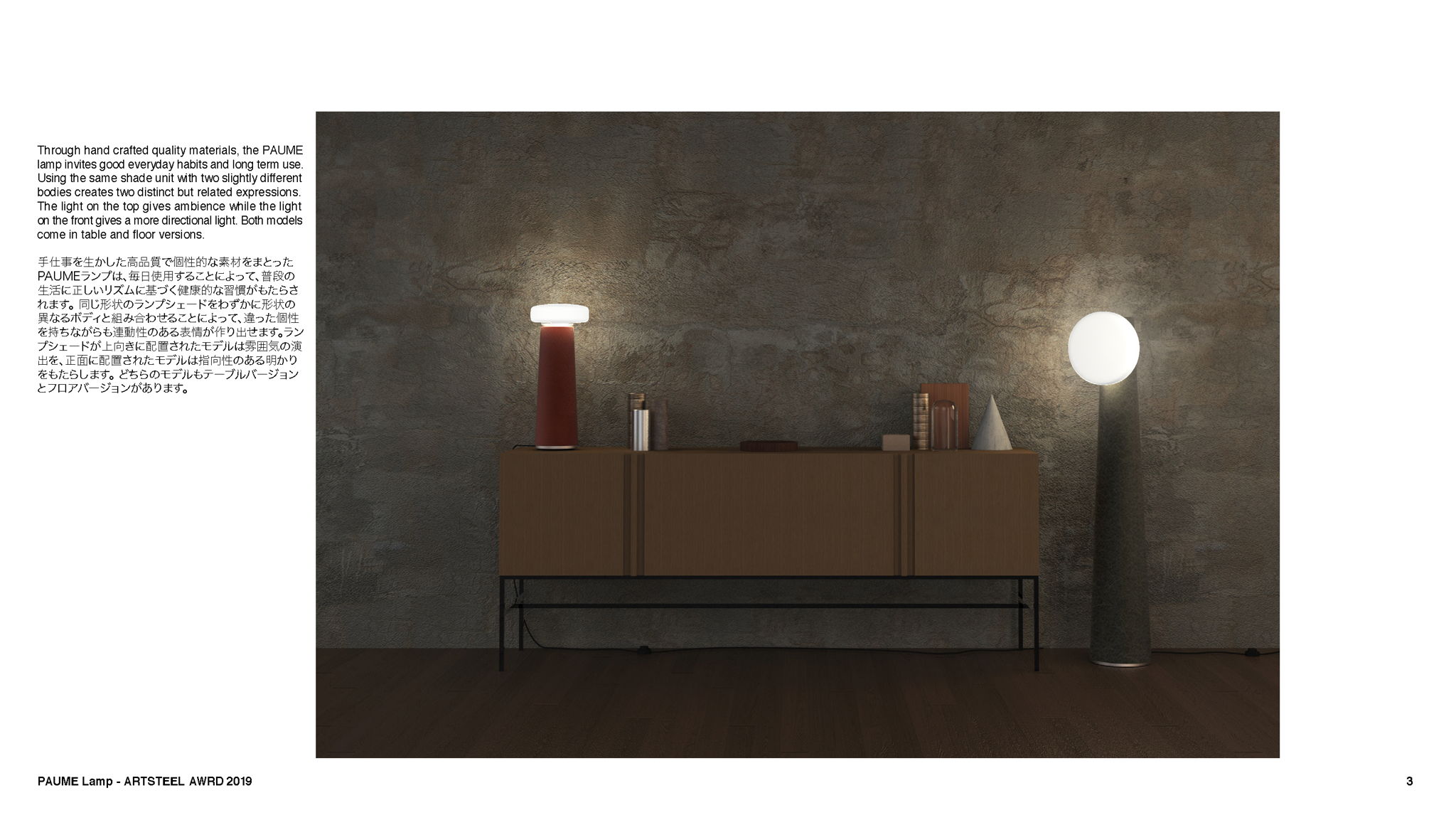 The idea for this product came during a trip to Japan, inspired by the sun rising over a distant horizon. The distinct presence of the lamp lends character to the environment while maintaining harmony with the surroundings. Through crafted design and quality materials, it invites good habits and long term use. Using the same diffuser unit with two slightly different bodies creates two distinct but related expressions. The light on the top gives ambience while the light on the front gives a more directional light. Both models come in table and floor versions. PAUME \pom\ is French for the palm of the hand. It’s through the palm that we get to know our objects, forming habits and lasting relationships. This is what we seek to communicate with this product.