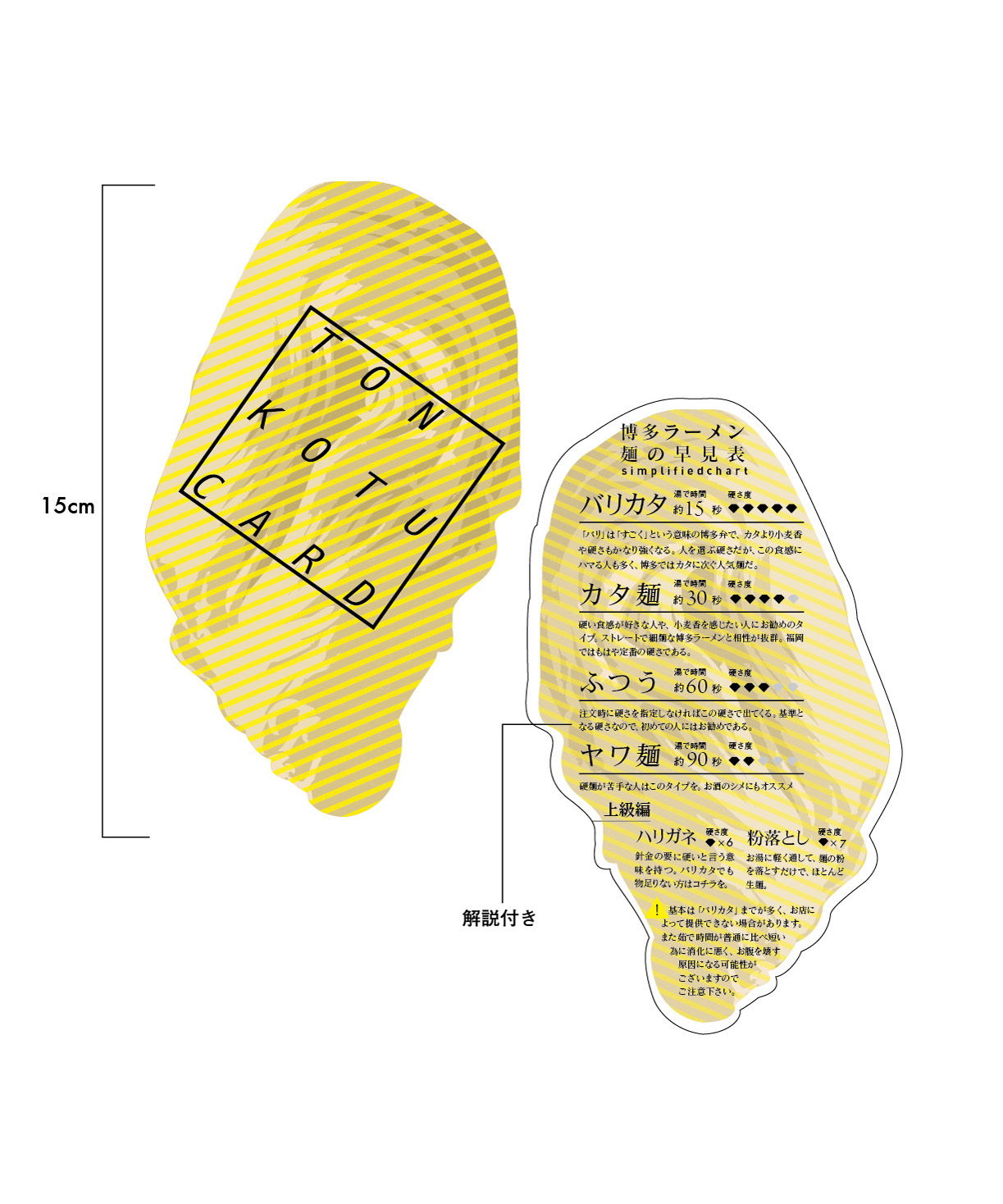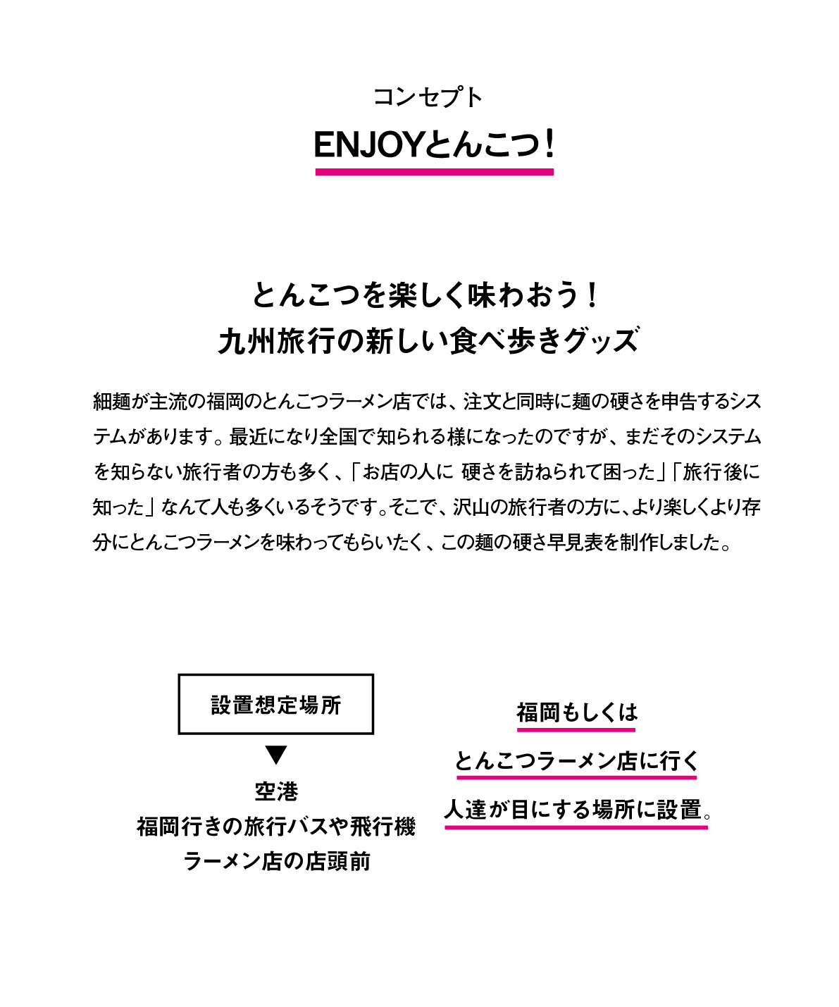 細麺が主流の福岡のとんこつラーメン店では、 注文と同時に麺の硬さを申告するシステムがあります。 最近になり全国で知られる様になったのですが、 まだそのシステムを知らない旅行者の方も多く、 「お店の人に 硬さを訪ねられて困った」 「旅行後に知った」 なんて人も多くいるそうです。そこで、 沢山の旅行者の方に、より楽しくより存分にとんこつラーメンを味わってもらいたく、 この麺の硬さ早見表を制作しました。