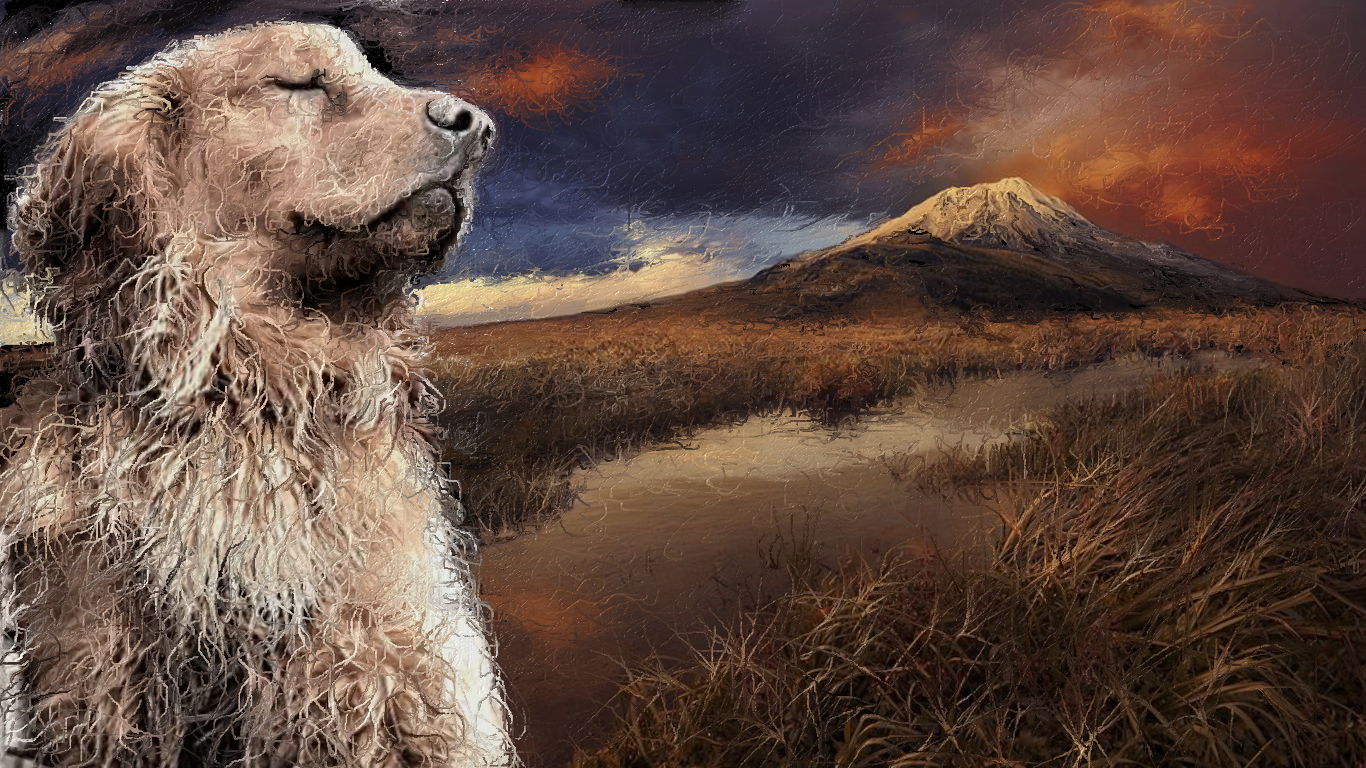 昨日描いた絵ですが僕のお気に入りです、富士山の裾の草原に吹き降ろす夏風邪を、バックにゴールでレッドリバー犬をお絵描きしてみました。