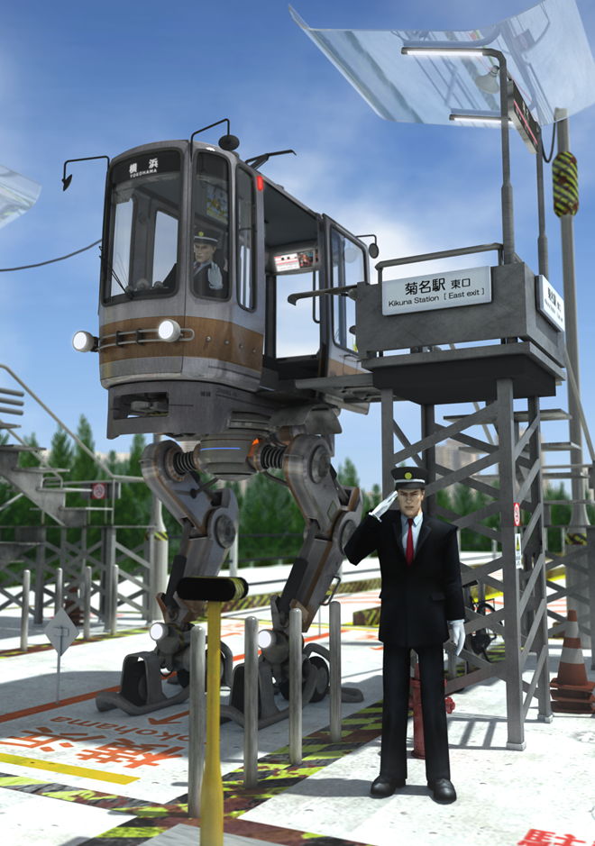 「近未来の古き良き故郷で往来する,地元に根付いた電車」を想像して描きました.各駅停車はゆっくりと歩き,急行は足の車輪を使って走ります.江戸時代の“籠(かご)”を思わせるデザインで,時間に束縛されることを感じさせないゆったりとした高級感を表現しました.