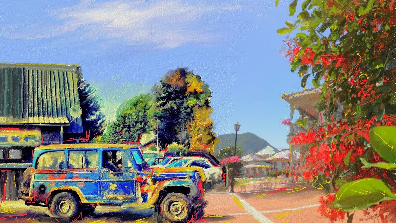 以前に描いた南国カラーの車のある家の風景画で、色編集加工してみました。