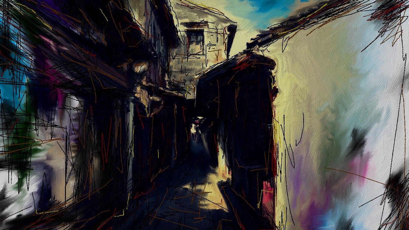 以前に描いた絵ですが、色編集加工してみました、僕のお気に入りの作品です、何処にでもありそうな路地裏の風景をアート風にお絵描きするのが好きです。