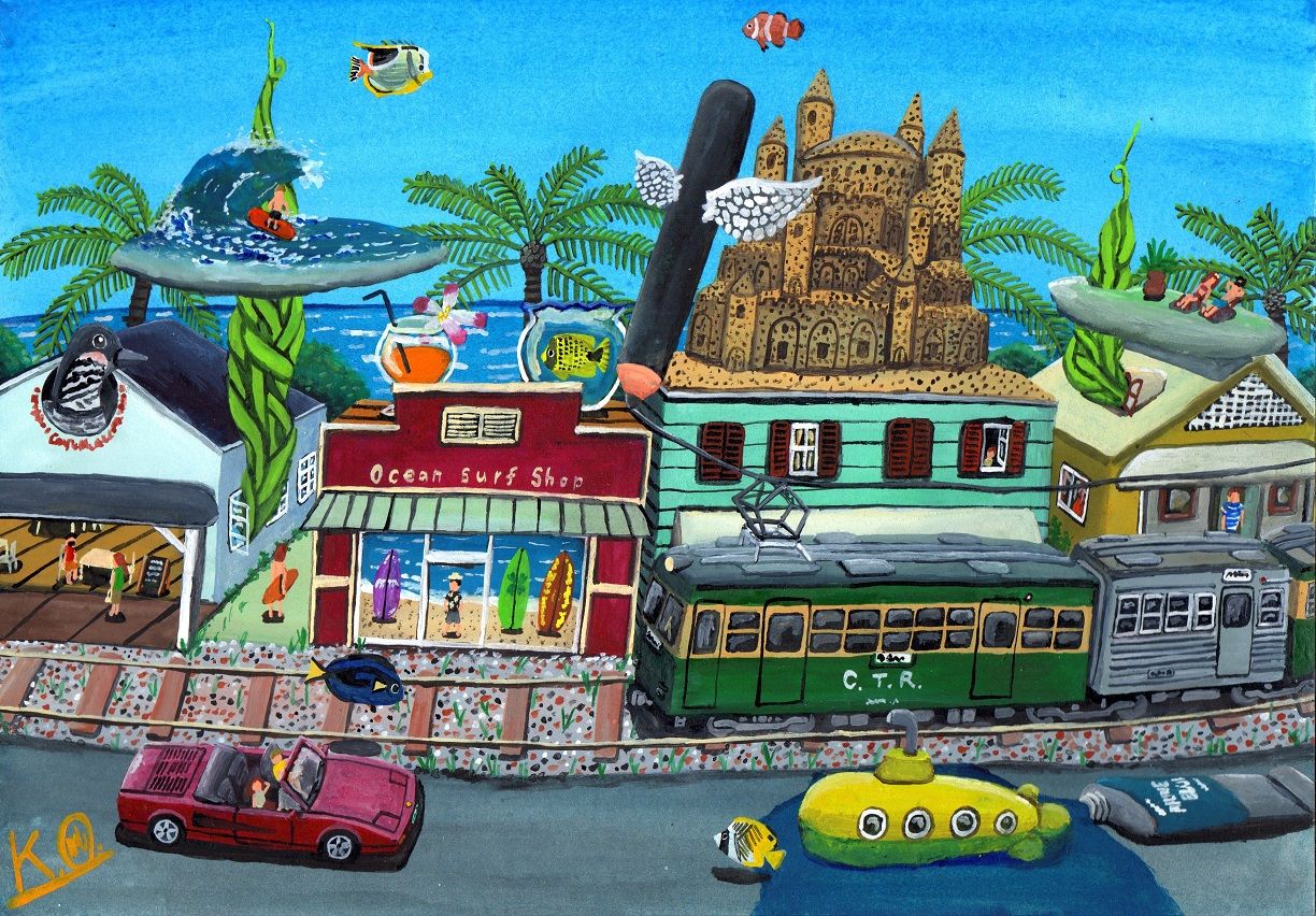 描くに当たっては「そう言えばハワイのような風景をバックにした鉄道風景(の絵)って無いよなぁ...」と考えたのがきっかけでした-実際、昔はハワイにも旅客用の鉄道が走っていたりしたそうですが、今は観光鉄道位しか残っていないようです。