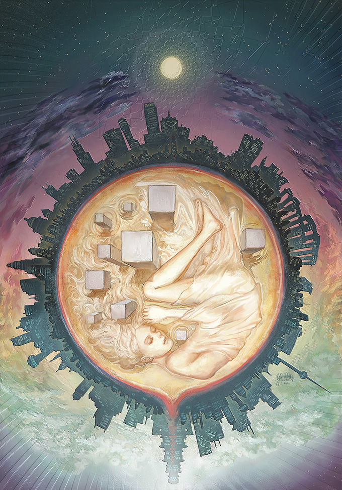 しかしながら、地球は高層ビルの殻で覆われ、徐々に生命力をうしなっているように感じることがあります。 それでも私は、地球は真なる力をうちに秘め、新しい世界を作ろうとしている地球の姿と、それに対する希望を、この絵で表しました。