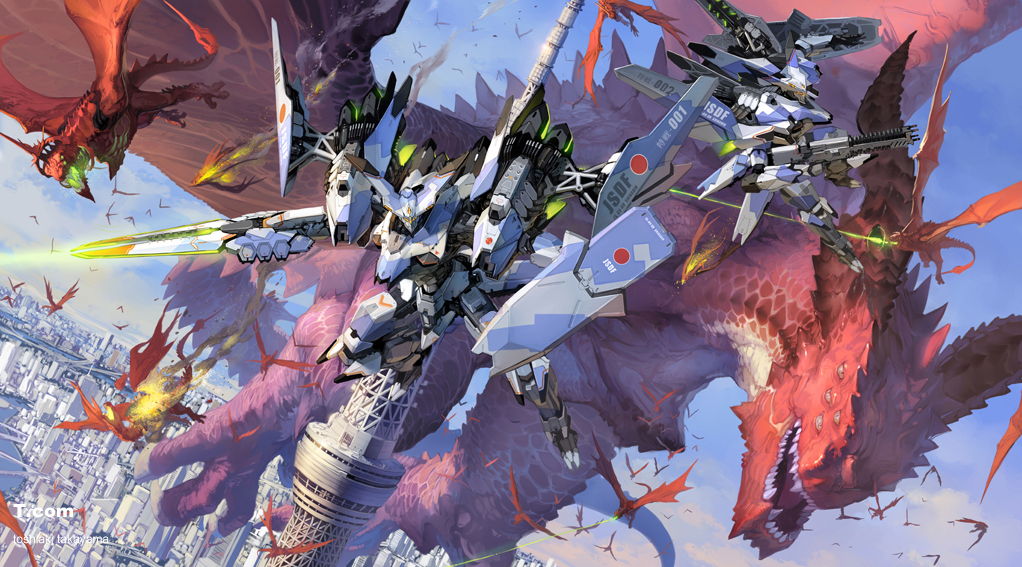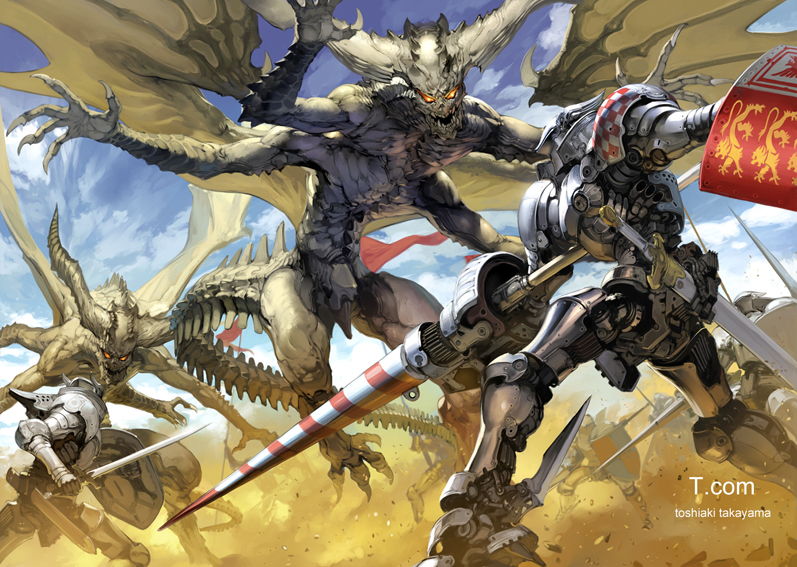 こちらも個展用に製作したイラストです。人の力では対抗できない巨大なモンスターたちに立ち向かうべく、鋼鉄の騎士に乗り込み戦う騎士達の合戦絵です。巨大なロボたちは中世の騎士にならいデザインされています。