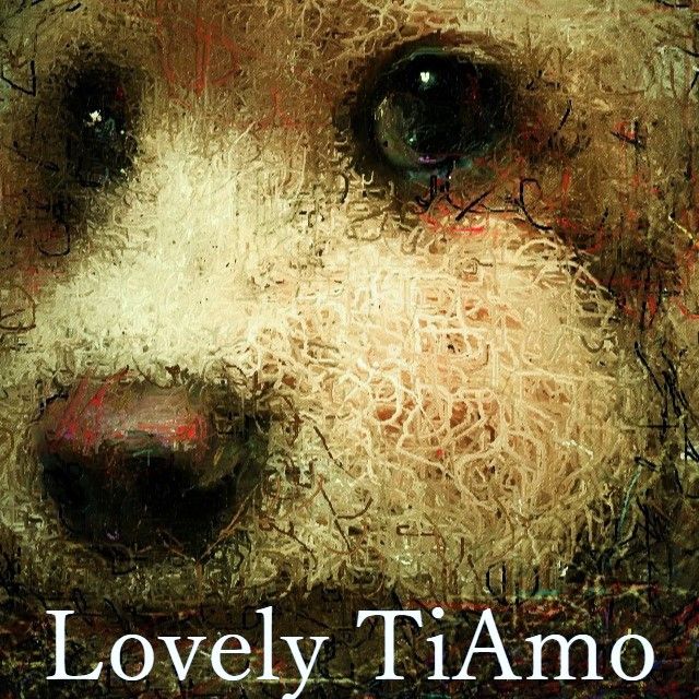愛犬ティアモを文字を入れて編集加工しました、ドアップの愛犬ティアモの目線が人間的に見えます。