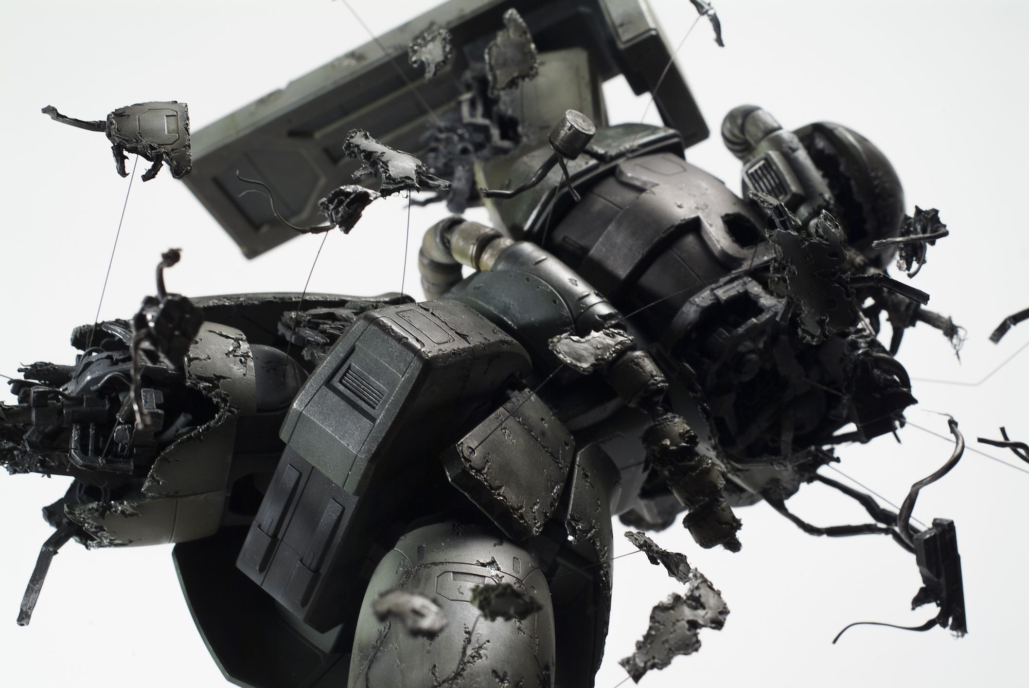 戦場で大破し宇宙空間に漂う一機のモビルスーツを製作しました。このモビルスーツがどのように敗れこの有様になったのか、浮遊しているパーツの一つ一つ、破損箇所などから想像しながらご覧頂けると幸いです。