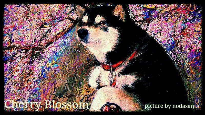 今年の春の絵で、フェンスに手を掛けて花見する黒の柴犬です。
