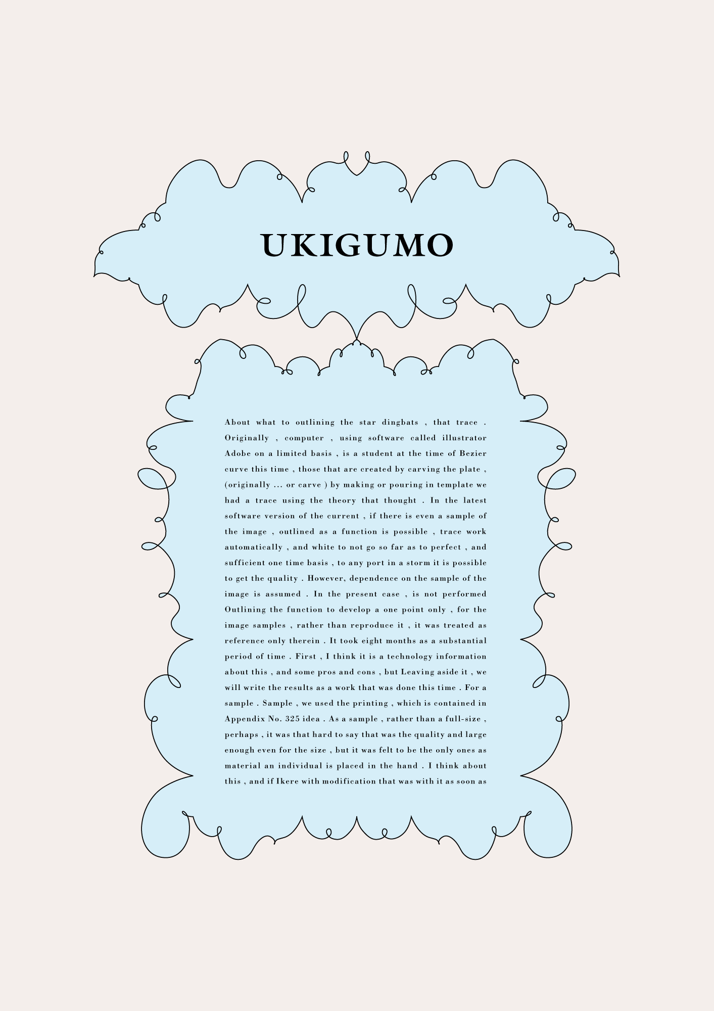 文字を書くように、文字がまるで音のような波長を描く様を、花形装飾活字に仕上げました。定着しない浮遊感を基礎とし、「水草」に漂う霧や雲のような表現を目指しました。