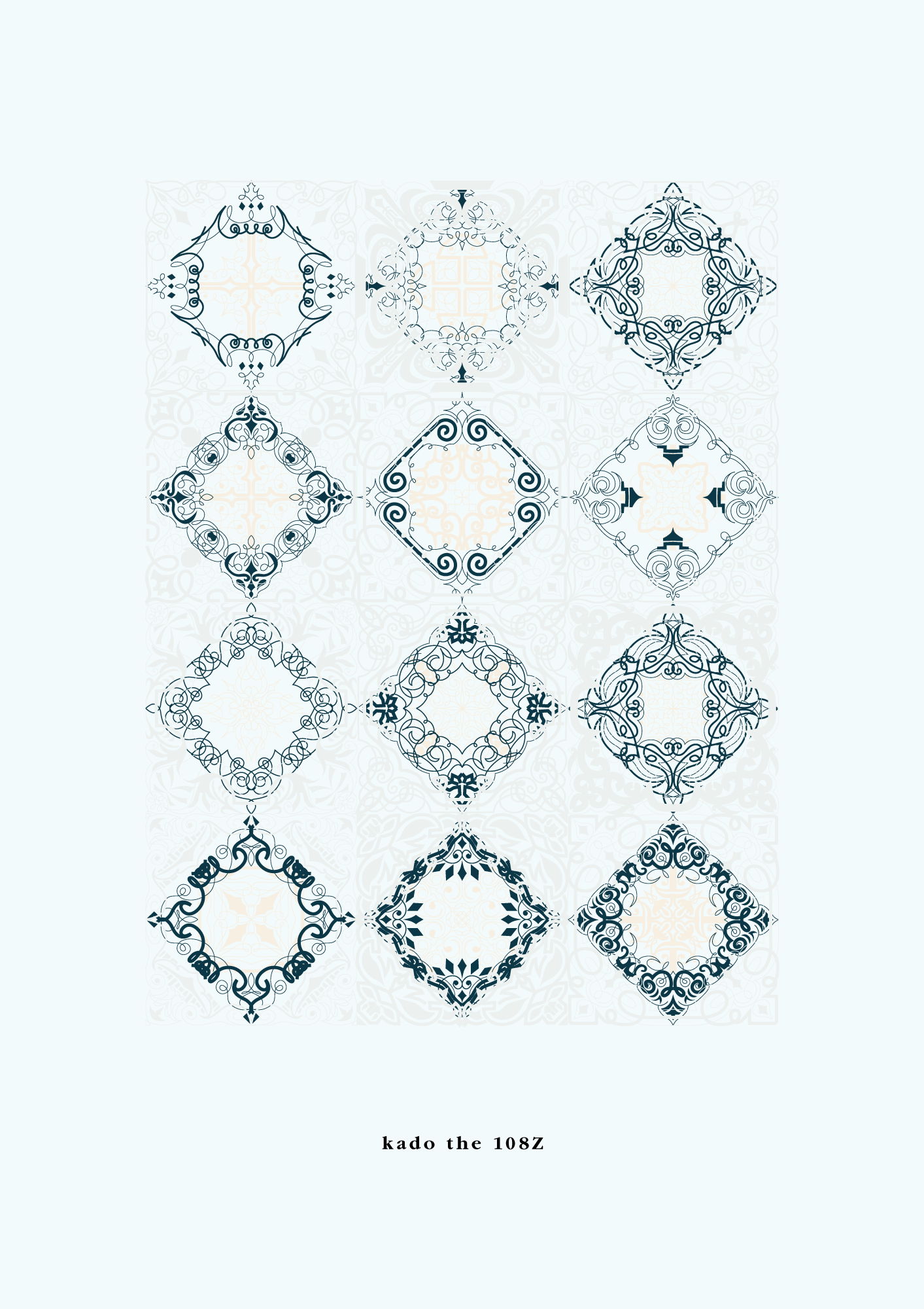 アドビイラストレーターにてアウトライン化した著作権フリーの角の装飾活字を108の系統で10種類ずつ1080個をご用意しました。過去の文献からピックアップした108種類の装飾をサンプリングし手描きで書き下ろし、アドビイラストレーターや、現在の印刷に適したデータとして作成したものを、より深く広く使っていただく為にパレットとしての能力を高め、1080個もの装飾をサンプリングと手描きで仕上げました。