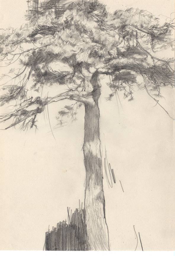 でかい松の水墨を描く準備段階。松をスケッチして頭の中に松と言うものをイメージする作業中。