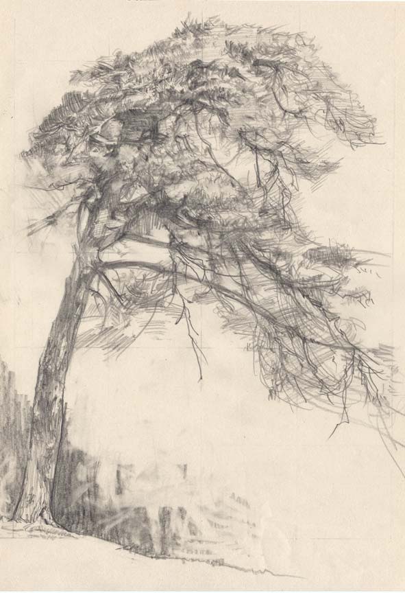 でかい松の水墨を描く準備段階。松をスケッチして頭の中に松と言うものをイメージする作業中。