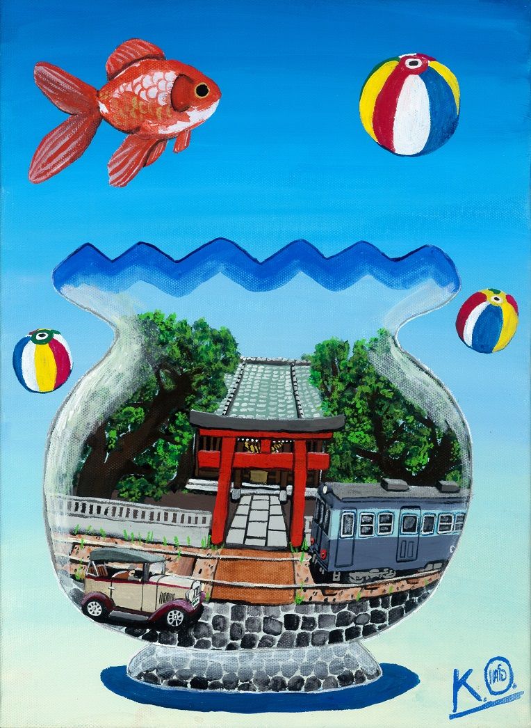 自分はこれまで殆ど所謂「日本的」な風景やモチーフを描く事が非常に少なく、何を描こうか考えていたある時に雑談の中で神社の話が出て来た時に「これだ!」と言う感じでこの絵の題材や全体の構図・モチーフが上手い具合に思い浮かんで行きました。