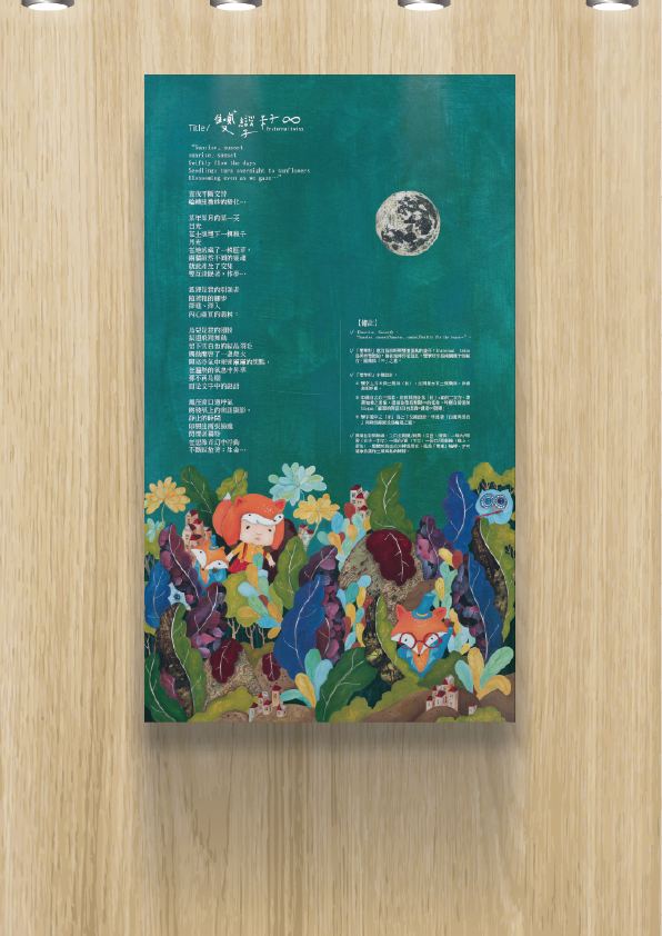 ※ 孿字體中之「糸」為上下交錯設計,呼應著「白晝與黑夜」同時的錯置及為輪迴之意。