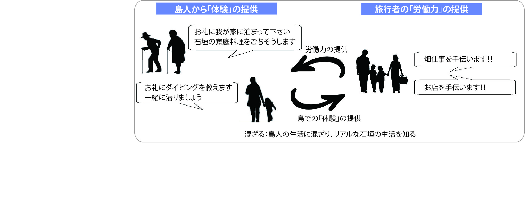 例えば、畑仕事の人手が欲しい島人と、石垣の生活を深く知りたい旅行者が「出会う」。旅行者はある1日は畑仕事を手伝い、その見返りとして島人は一宿一飯を提供する。石垣の家庭料理を楽しみ、泡盛を飲んで語らう、通常の旅行では出来ない体験を、労働の見返りとして受け取る。