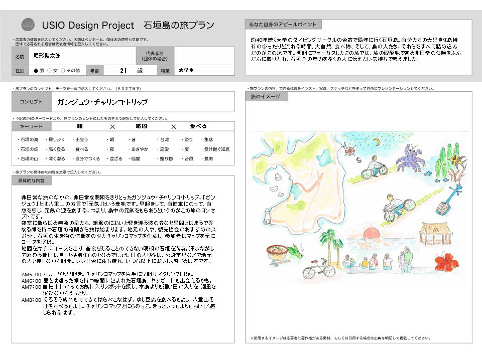 非日常な旅のなかの、非日常な明朝をきりとったガンジュウ・チャリンコ・トリップ。「ガンジュウ」とは八重山の方言で「元気」という意味です。早起きして、自転車にのって、自然を感じ、元気の源を食する。つまり、島中の元気をもらおうというのがこの旅のコンセプトです。