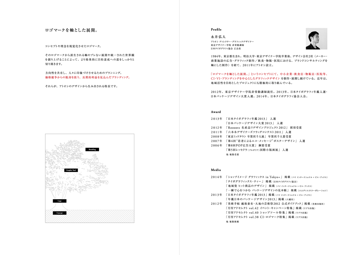 東京都生まれ。明治大学・東京デザイナー学院卒業後、デザイン会社2社(メーカー・商業施設の広告・グラフィック制作/飲食・物販・医院における、ブランドコンサルティングを軸にした制作)を経て、2011年にアトオシ設立。