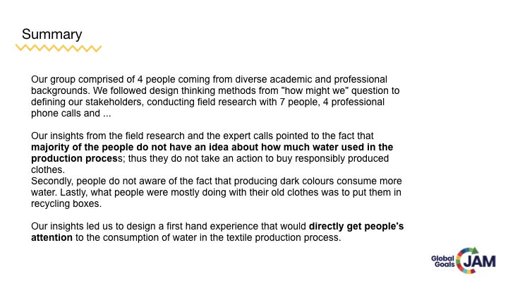Our insights from the field research and the expert calls pointed to the fact that majority of the people do not have an idea about how much water used in the production process; thus they do not take an action to buy responsibly produced clothes.